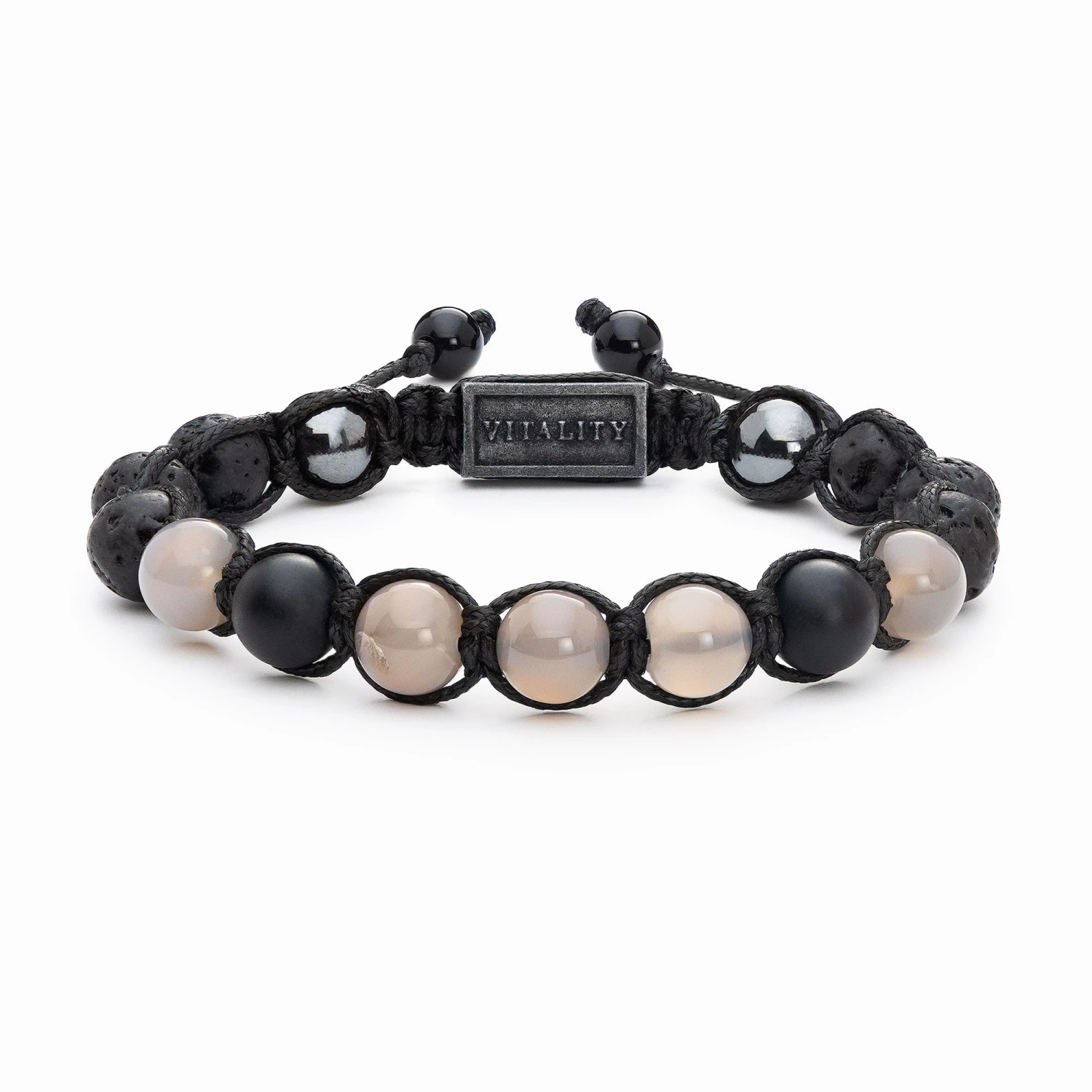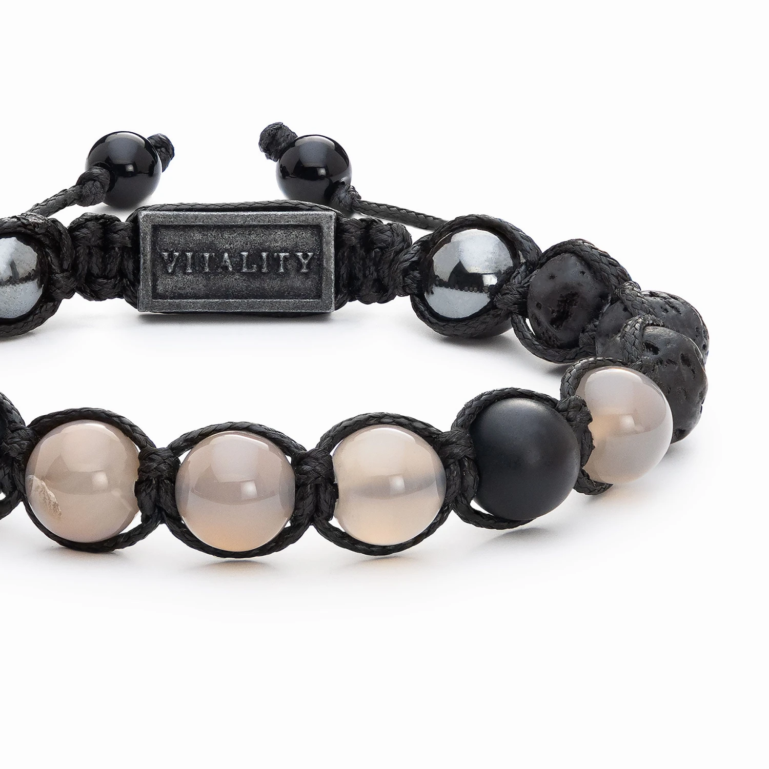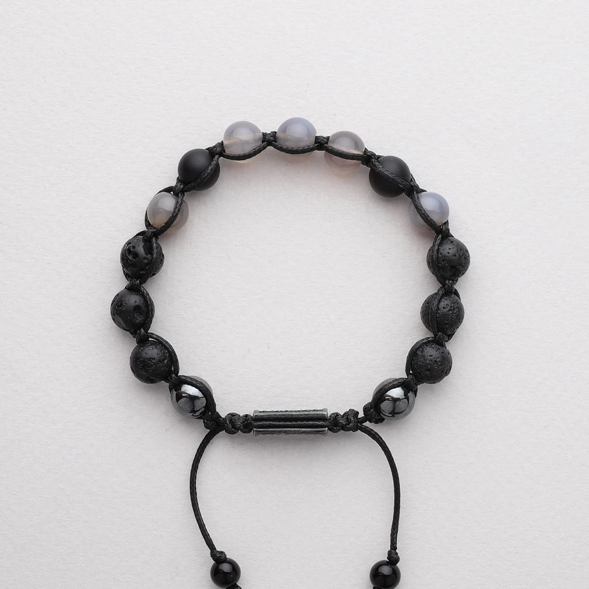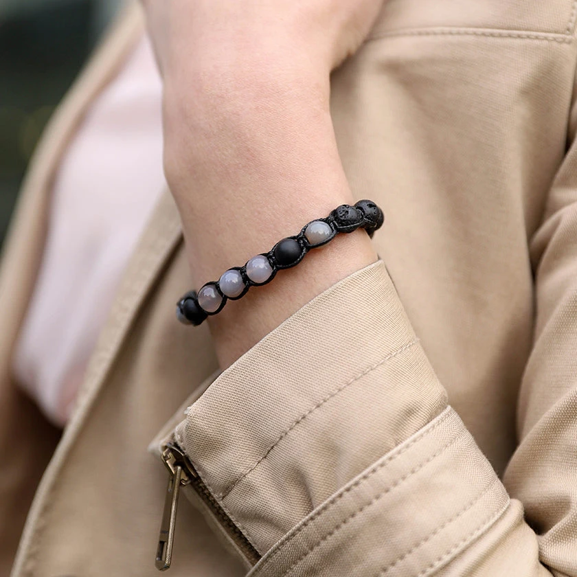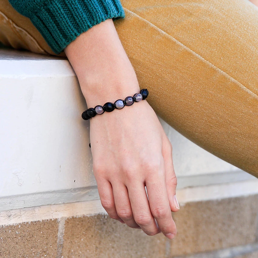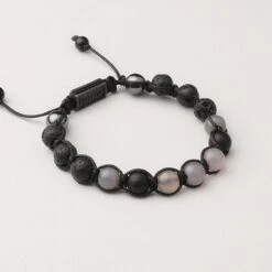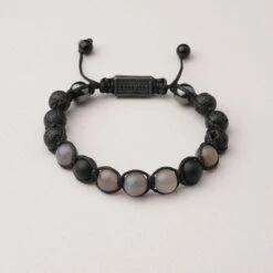 This handmade wax cord bracelet features gray agate and lava stones. Agate is an ideal stone for balancing all the chakras. It is a powerful grounding stone that promotes harmony, strength, and stability. The lava stone also known as “basalt” is a porous volcanic rock that absorbs essential oils for diffusing throughout the day. This stone has been solidified from molten lava after conditions of intense heat and pressure. It is known to be a grounding stone that has connections to Mother Earth promoting strength, stability and courage.