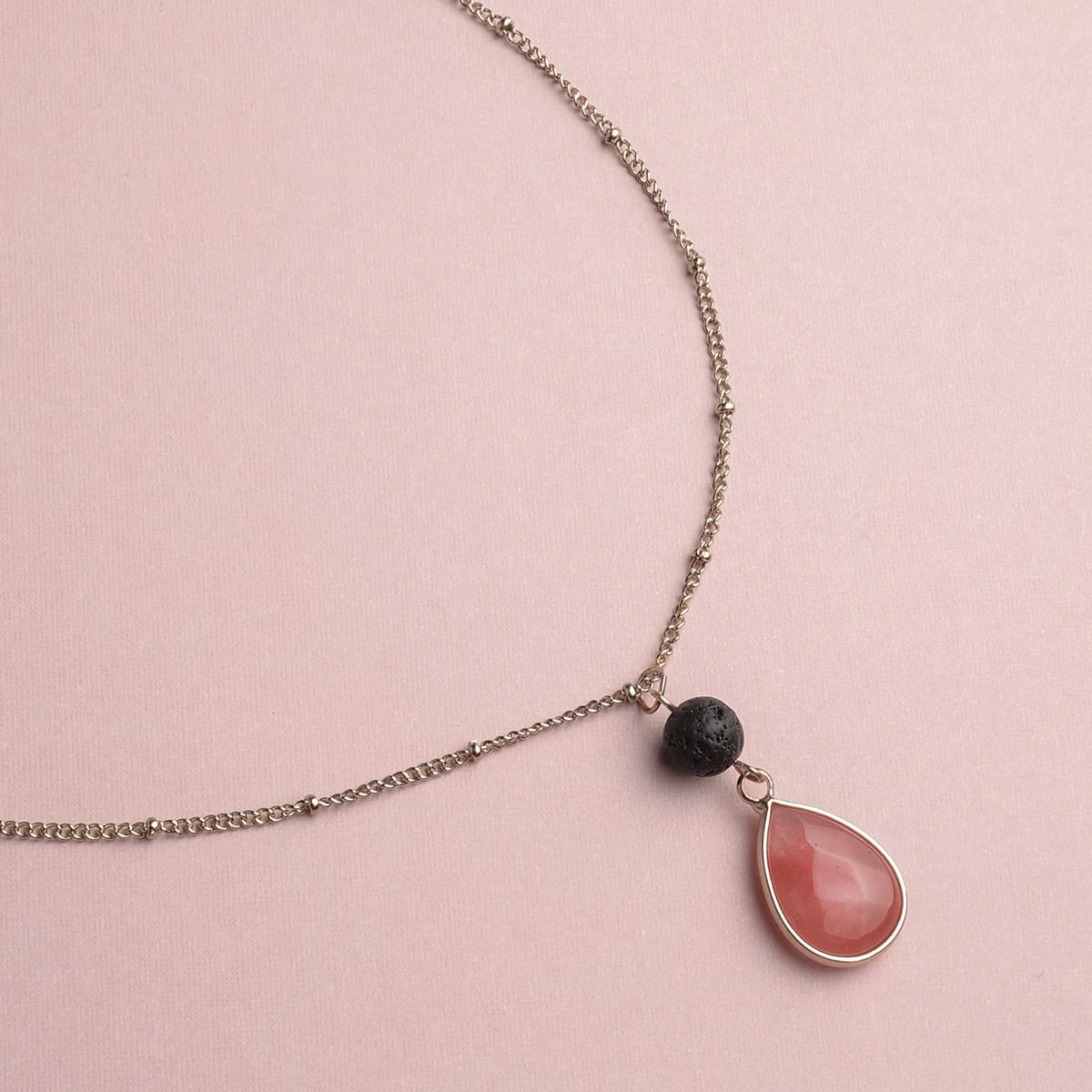 This beautifully designed necklace features a lava bead and a Cherry Quartz stone to capture the energy and essence your day while diffusing your essential oils. Formed from cooling magma, lava stone symbolizes rebirth and the releasing of negative energy. Additionally, Cherry Quartz is a stone of luck, known to encourage manifestation and fulfillment of one’s own potential. It is ideal for promoting hope, optimism, and self-actualization.