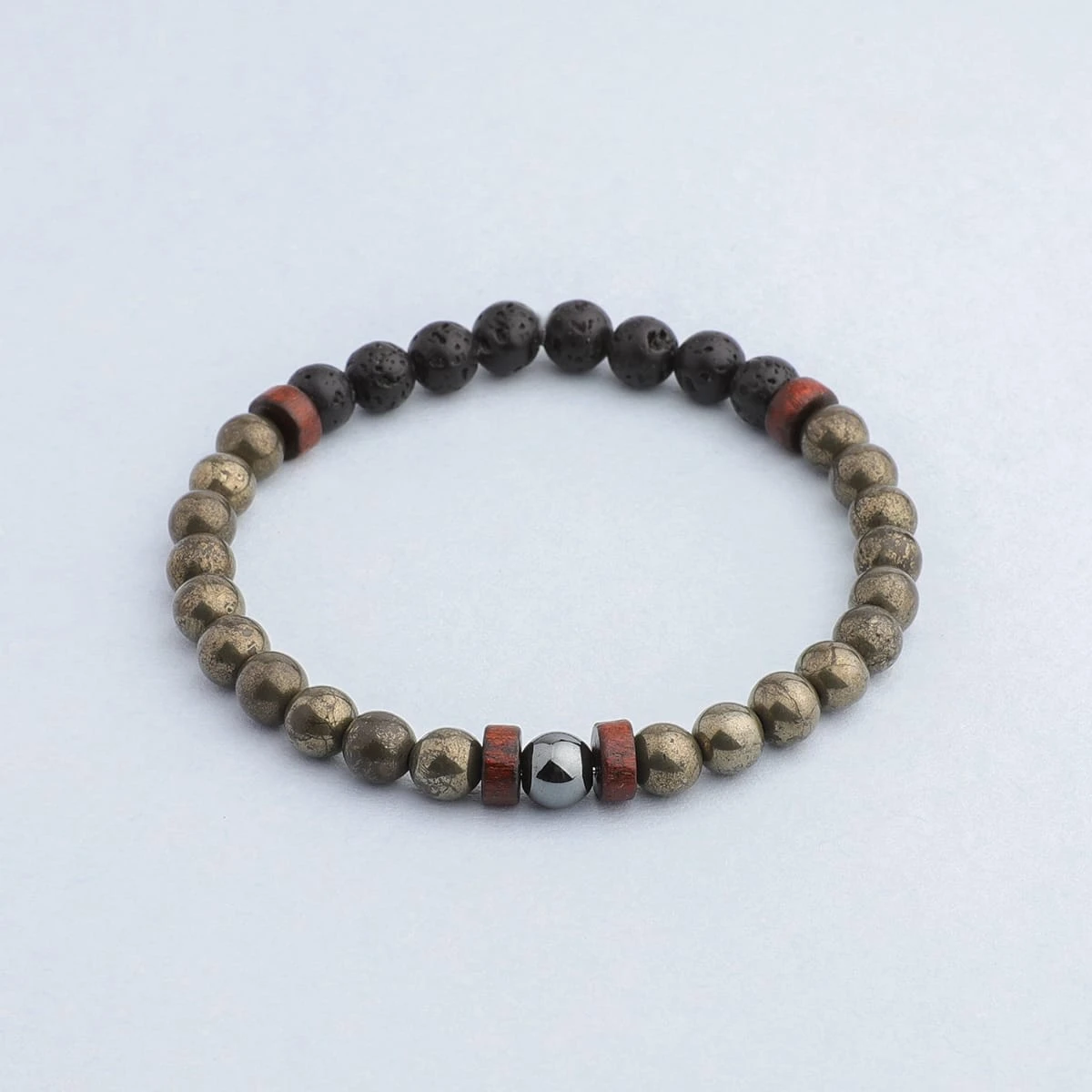 This aromatherapy bracelet includes Pyrite and Lava Stone beads, complemented with dark wood spacers and finished with a single Hematite bead.