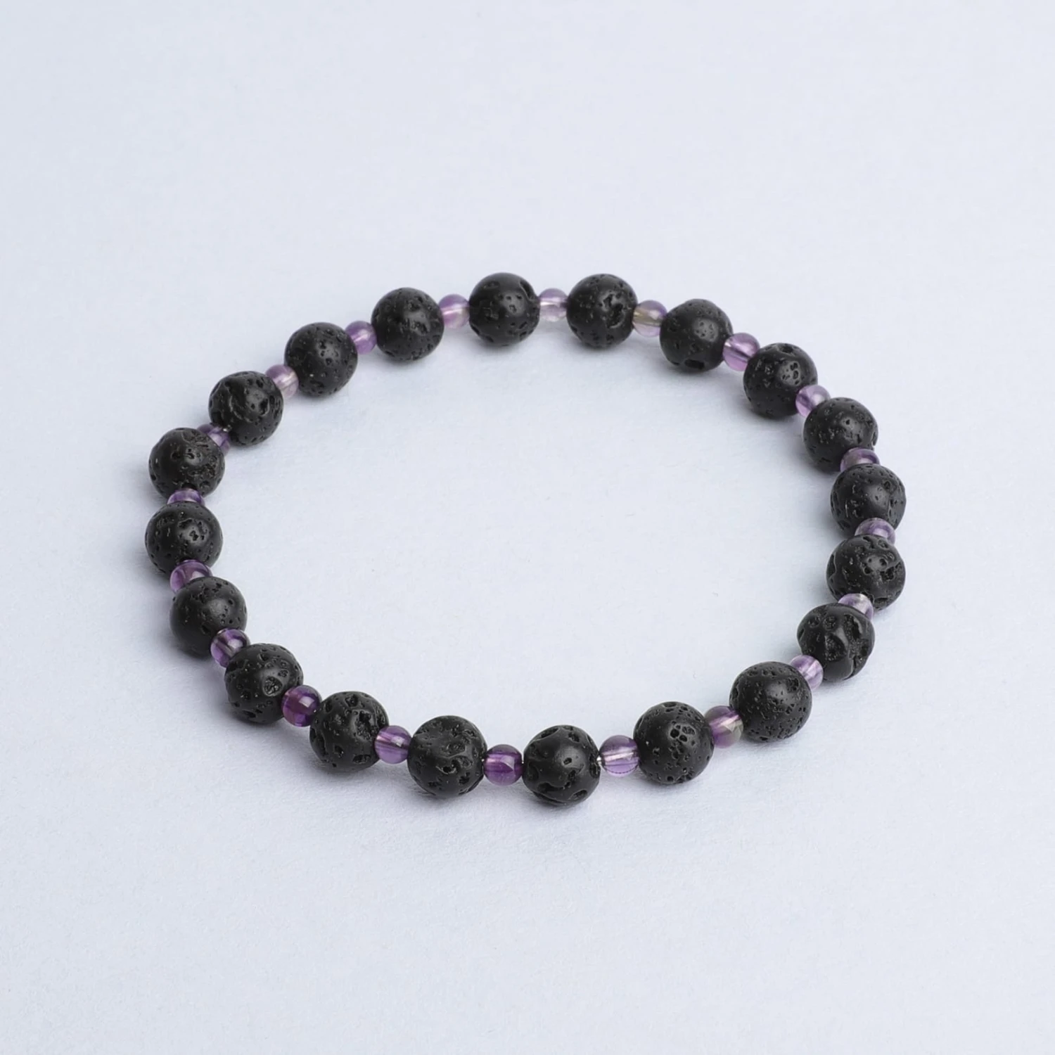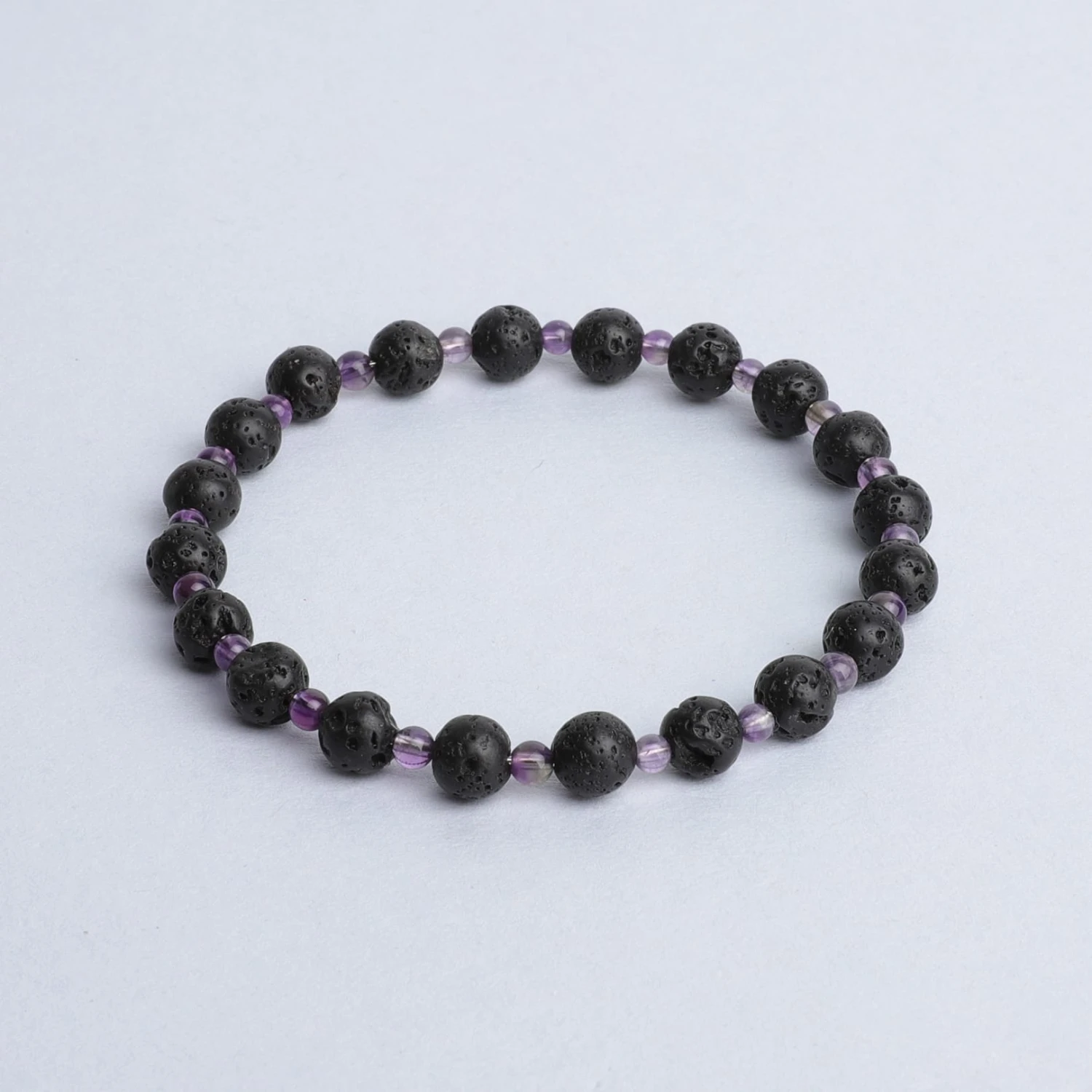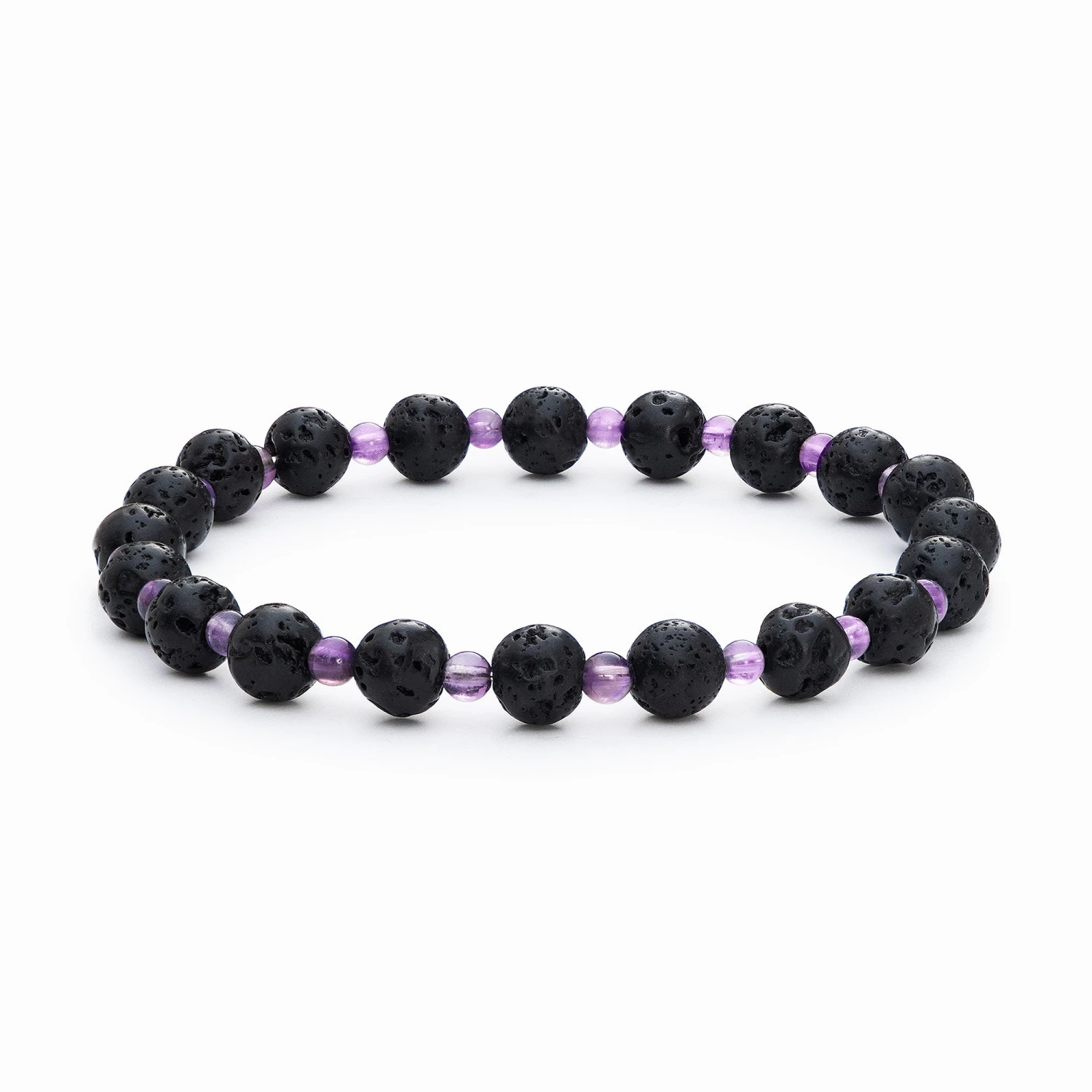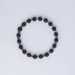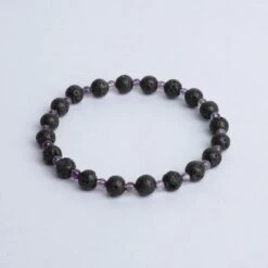 This diffuser bracelet includes Lava Stone beads complemented with Amethyst stone spacers.