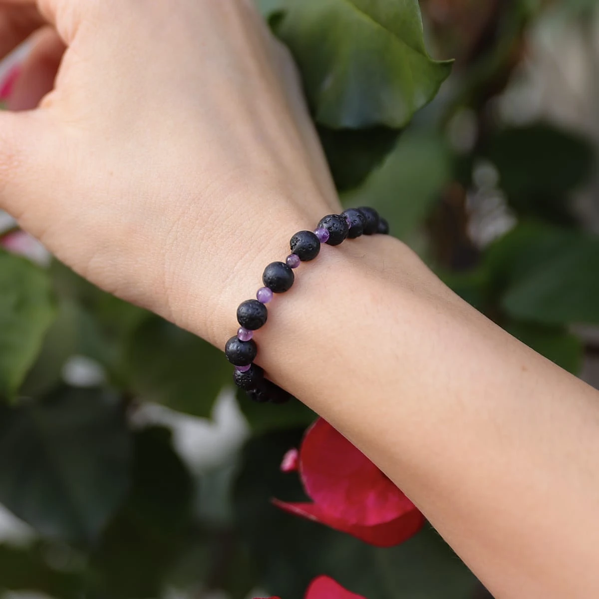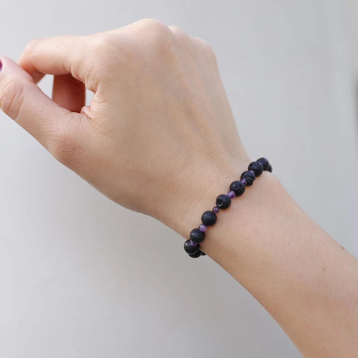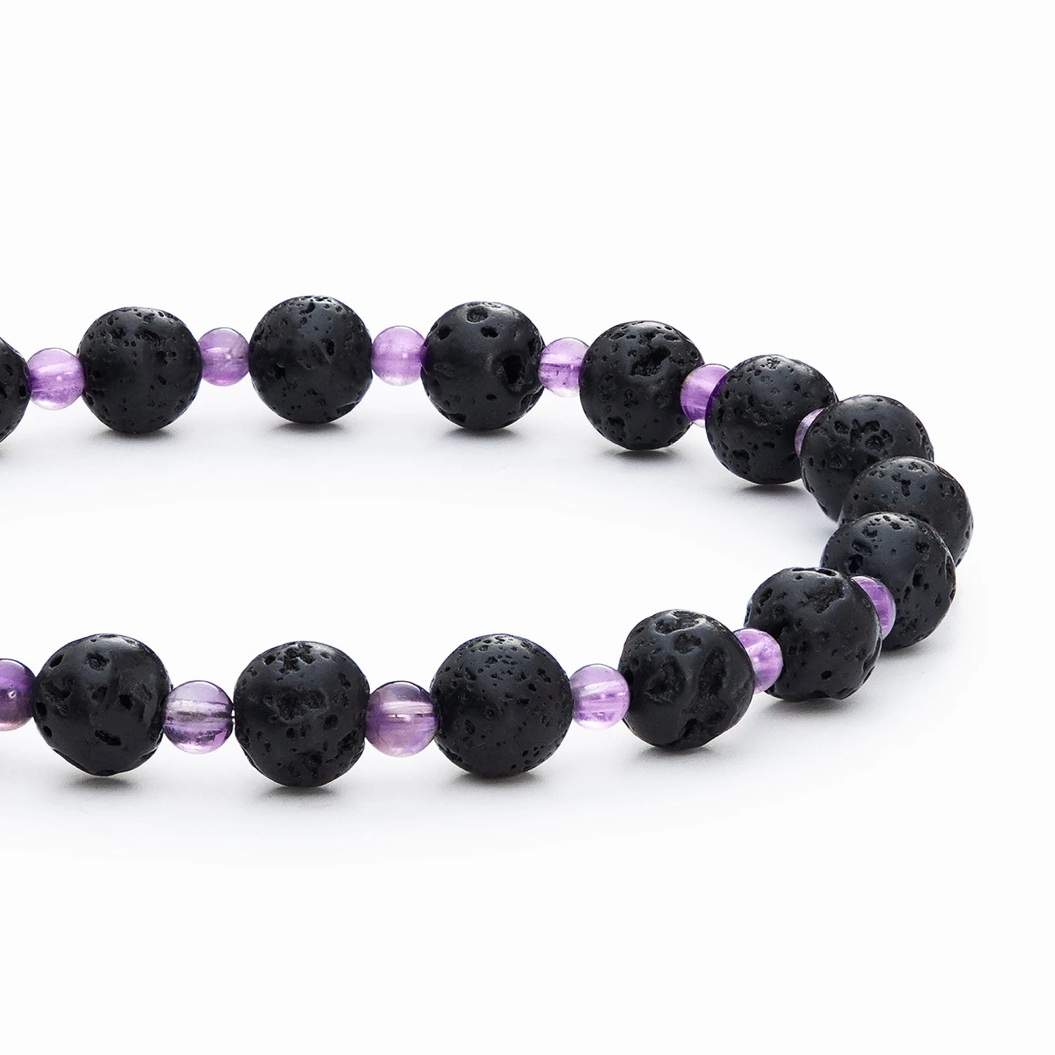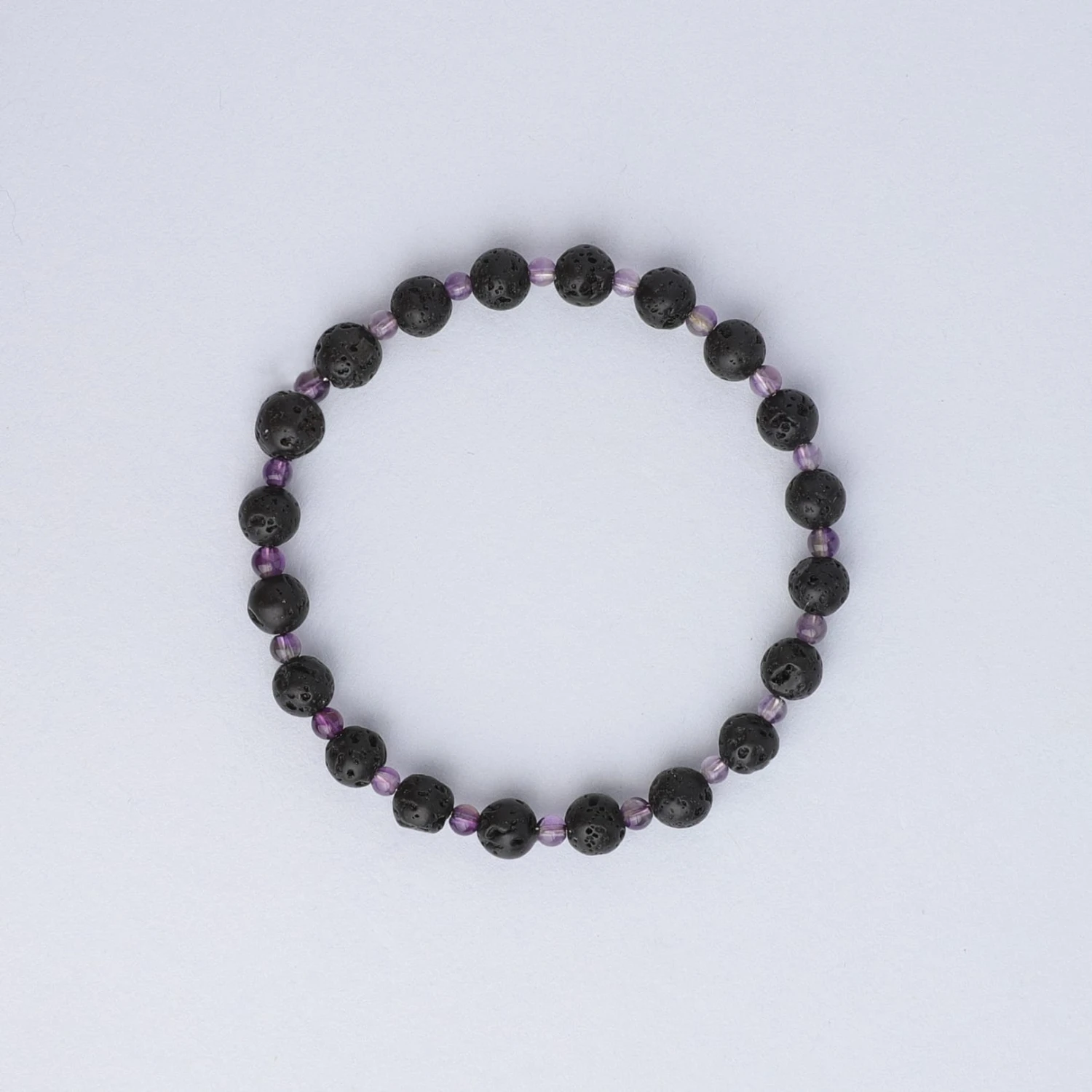 This diffuser bracelet includes Lava Stone beads complemented with Amethyst stone spacers.