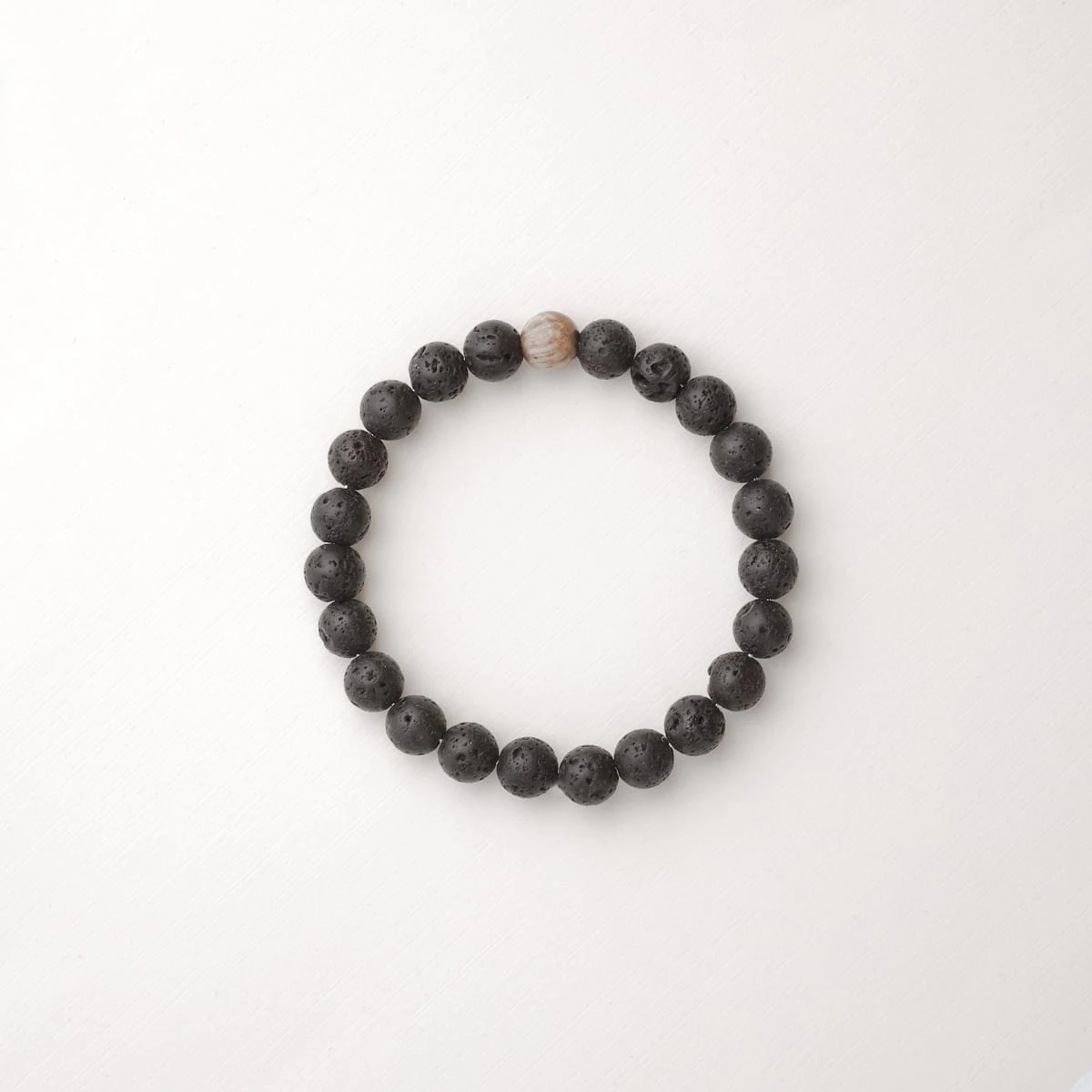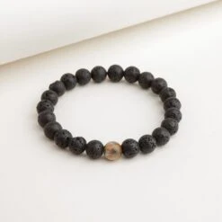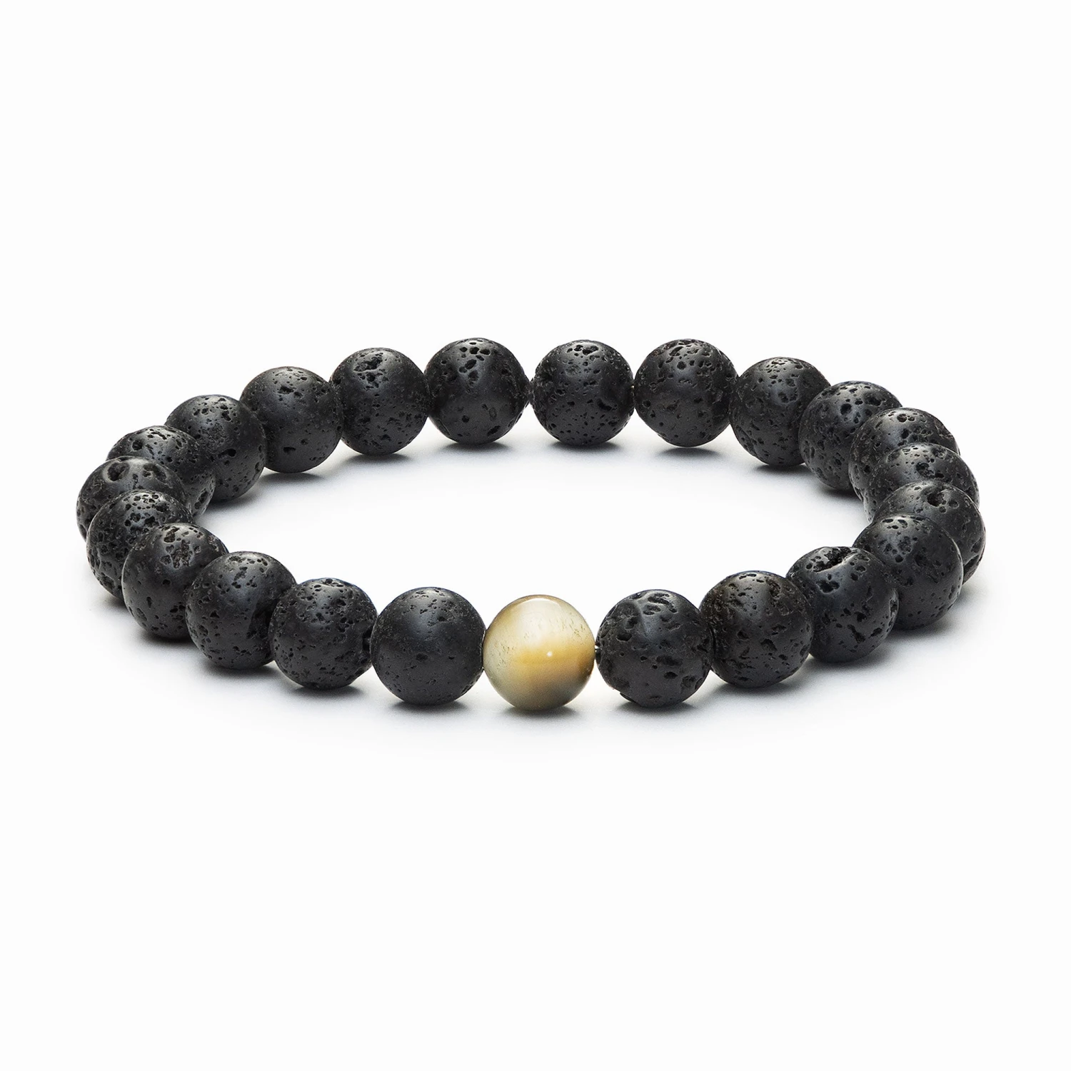 This aromatherapy bracelet includes Lava Stone beads finished with a single Tiger’s Eye stone.