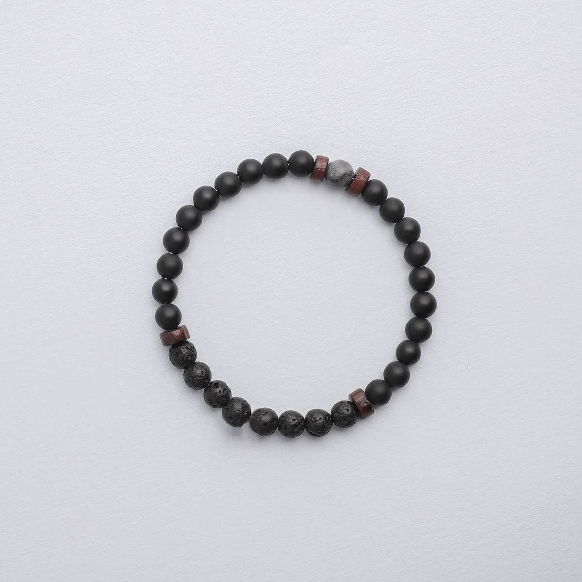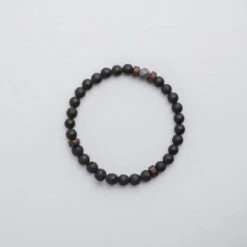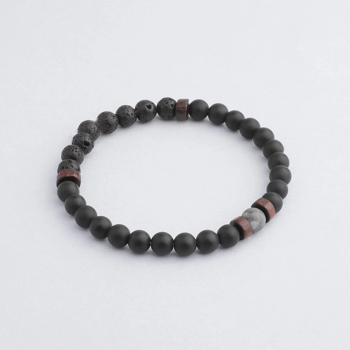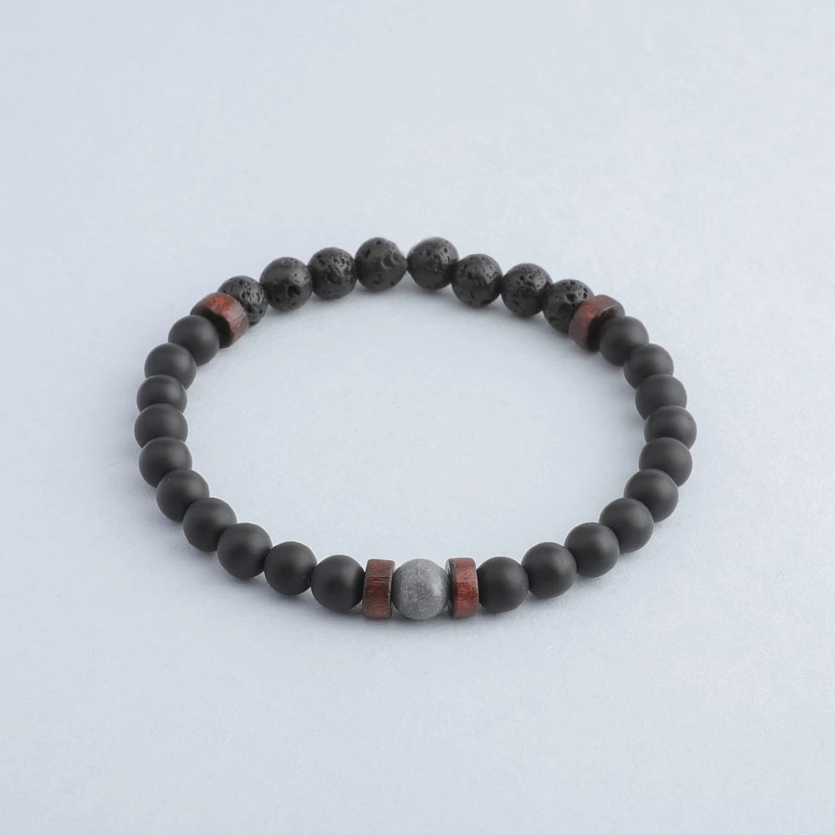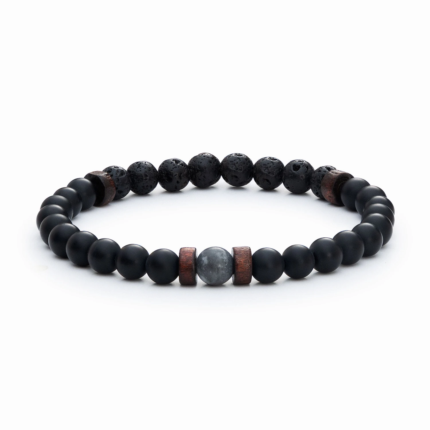 This aromatherapy bracelet includes Matte Grey Onyx and Lava Stone beads, complemented with dark wood spacers and finished with a single Black Labradorite bead.
