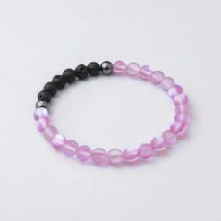 Get your glow on with a magical Glow Glass bracelet. Each spin to these frosted glass beads generates a flash of rainbow light resulting in an iridescent glow. This bracelet is finished with grounding lava stone and hematite.