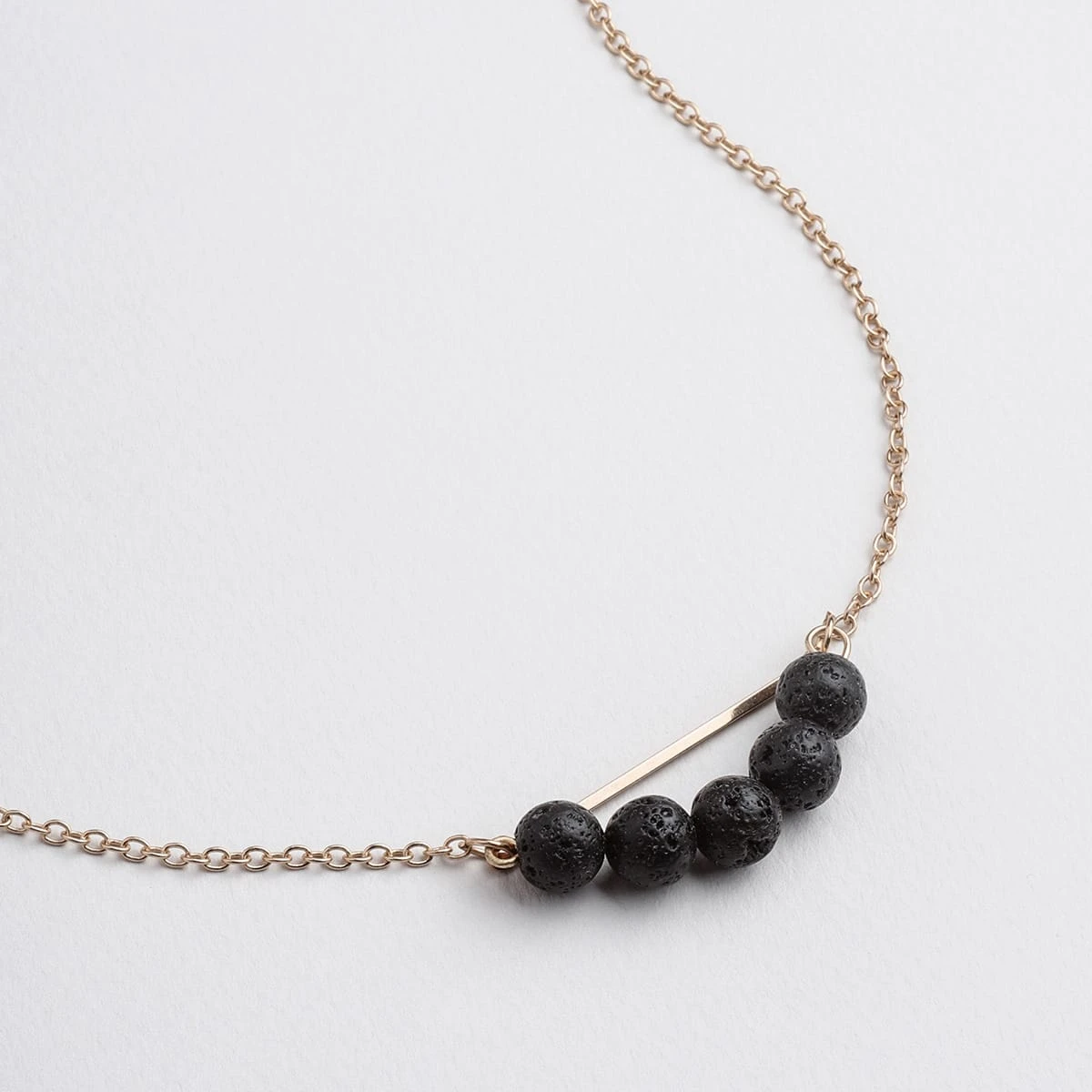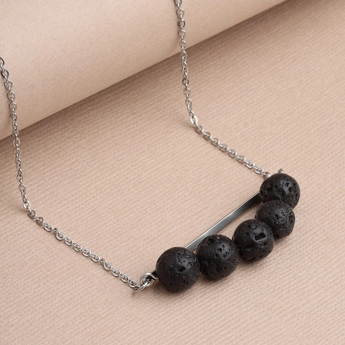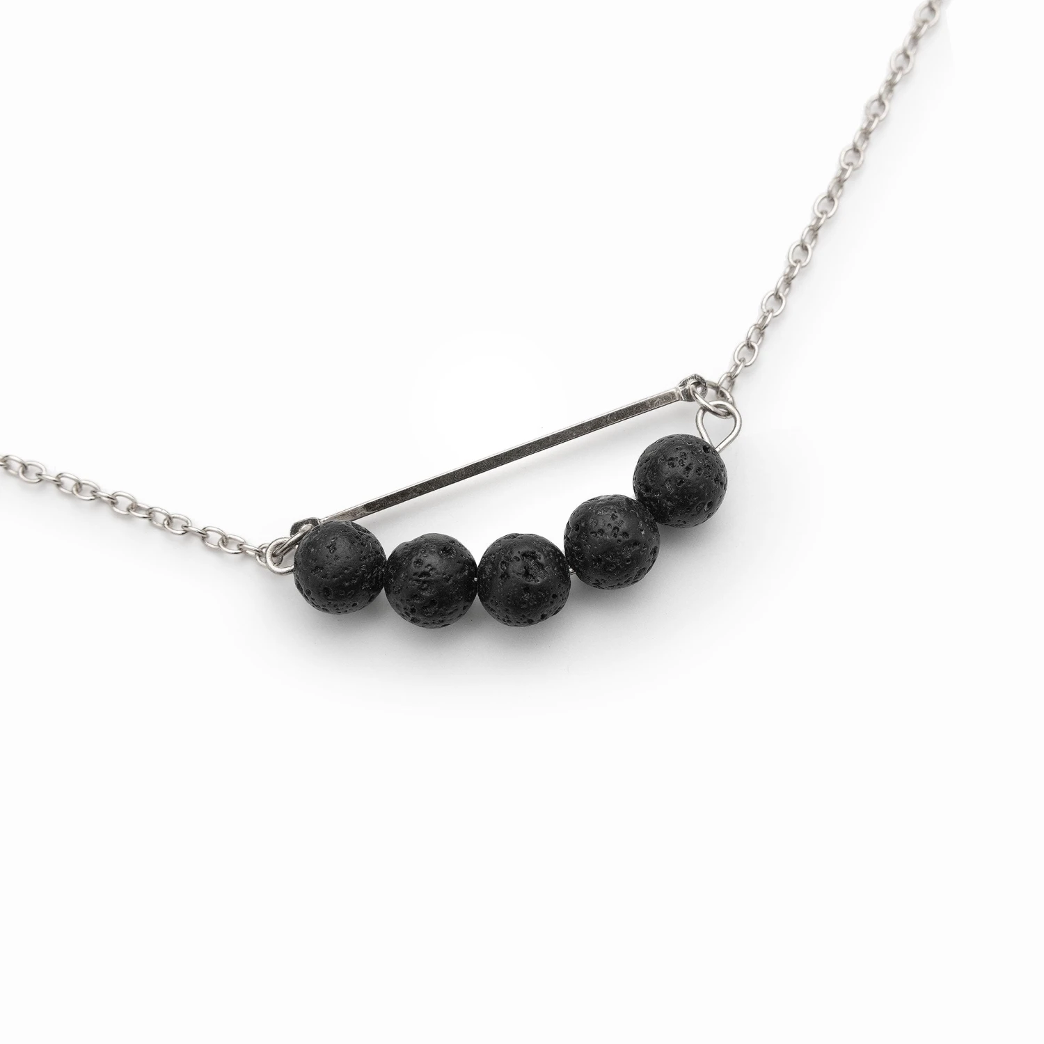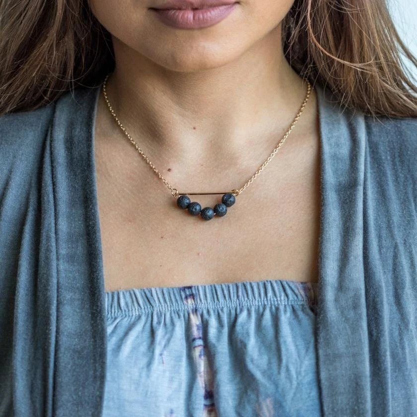 This elegantly crafted necklace is an excellent way to diffuse your favorite essential oils with personality. The natural lava stone beads which are porous provides a perfect way for essential oils to absorb and hold scent. The lava stone also known as “basalt” is volcanic rock that has been solidified from molten lava after condition of intense heat and pressure. It is a grounding stone that has connections to Mother Earth promoting strength, stability and courage.