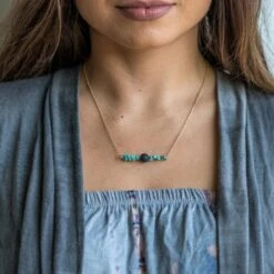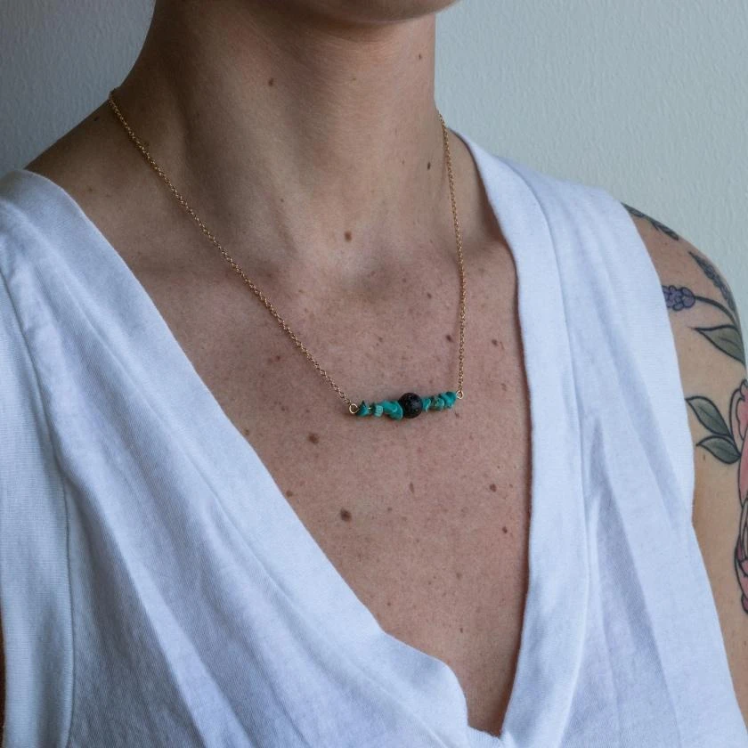 This beautifully designed necklace features a lava bead and natural Turquoise stones to capture the energy and essence your day while diffusing your essential oils.
