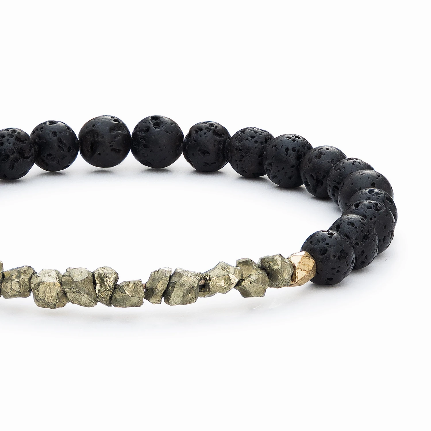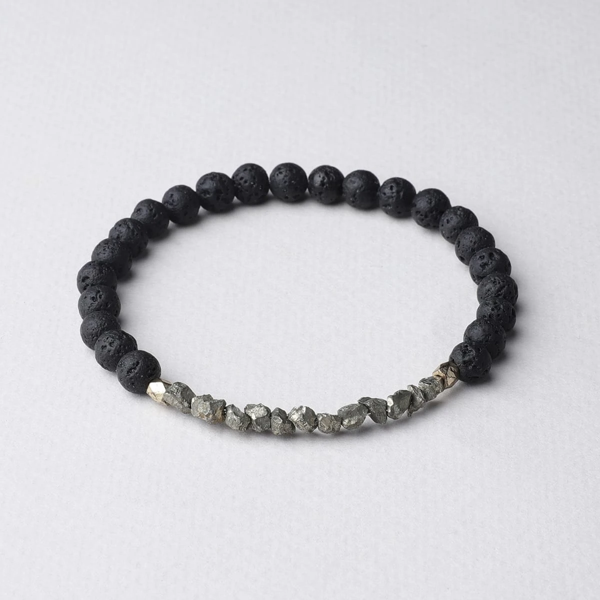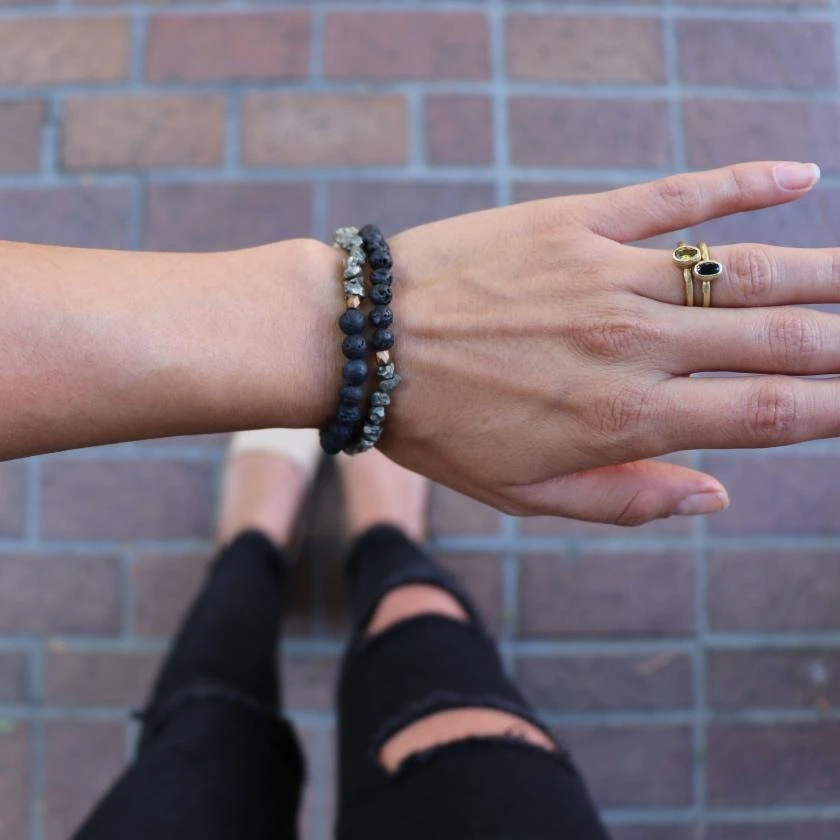 The Protect Diffuser Bracelet includes both Lava Stone beads and Pyrite. Pyrite is a protective stone that carries a masculine, assertive energy, which makes it ideal for encouraging action, persistence, confidence, and discipline. Lava Beads are made from Natural Volcanic Basalt. The lava stones acts as a sponge-like carrier as it soaks up your oils and retains them in the core of the Bead.