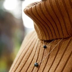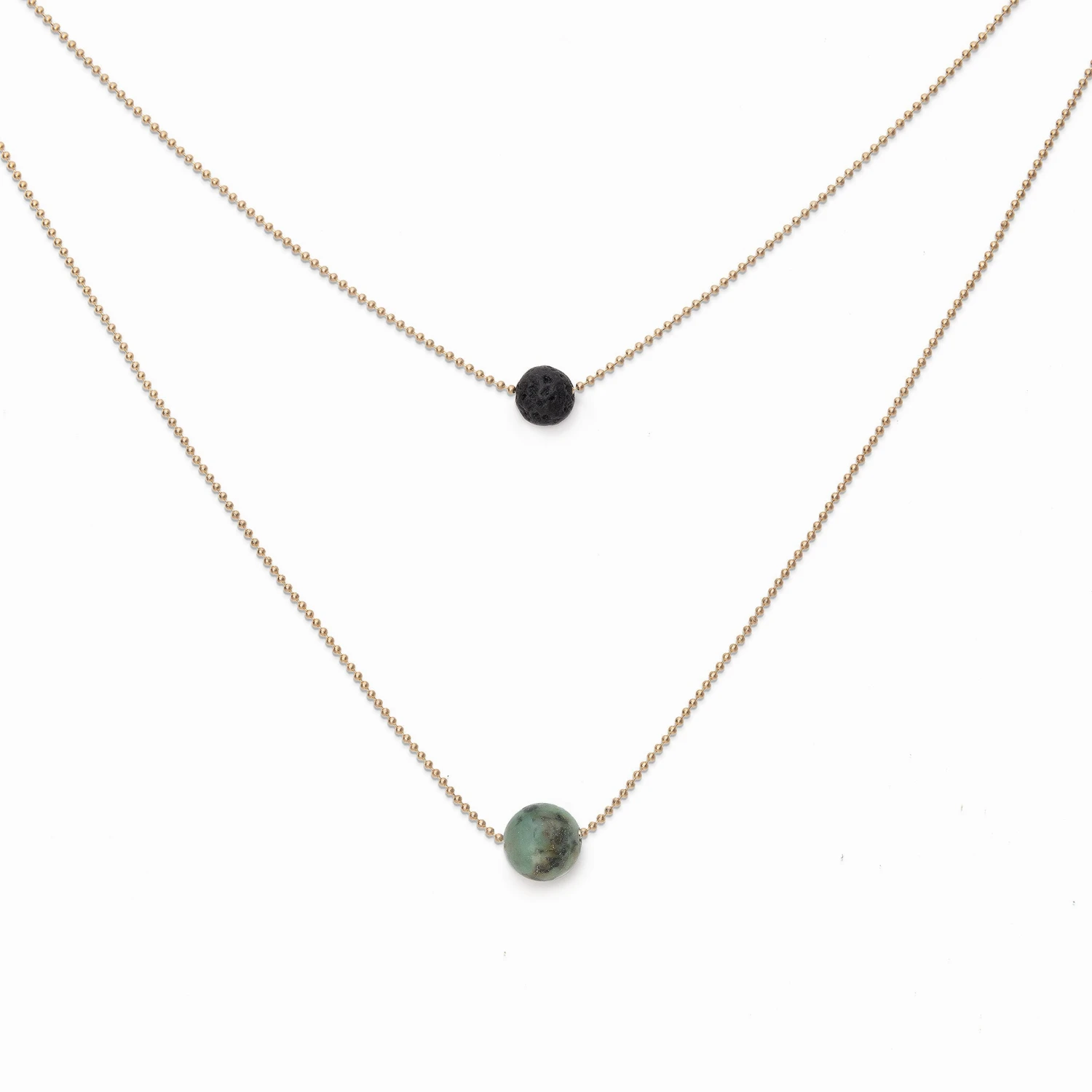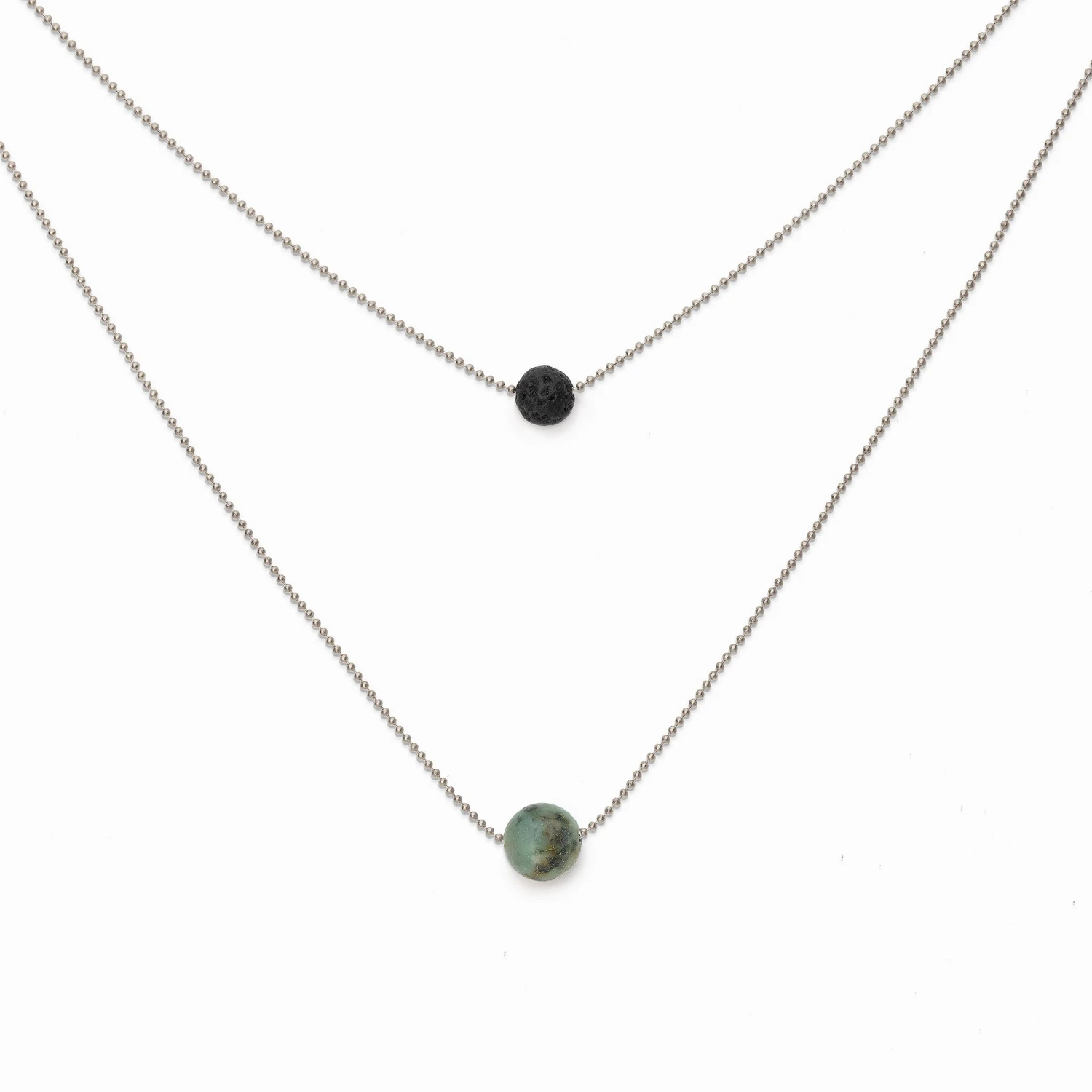 Carefully designed, this stylish necklace makes a statement because of its purity and elegance. It is made with two chains each centered with a porous lava stone and an African Turquoise stone.