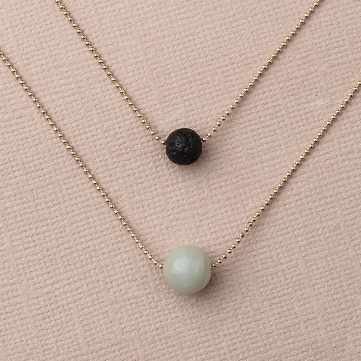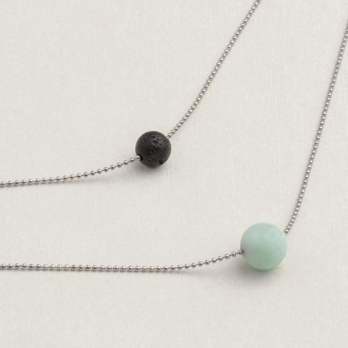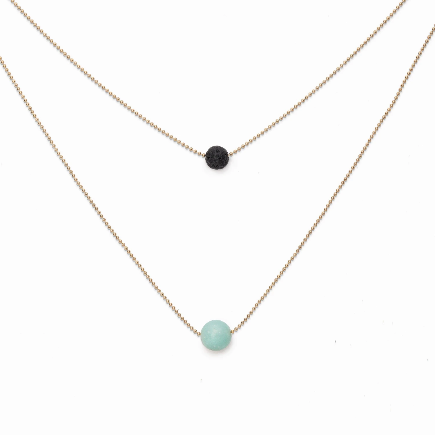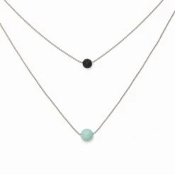 Carefully designed, this stylish necklace makes a statement because of its purity and elegance. It is made with two chains each centered with a porous lava stone and an Amazonite stone.
