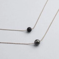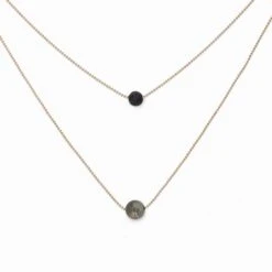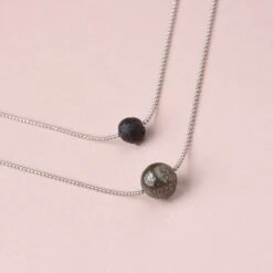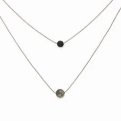 Carefully designed, this stylish necklace makes a statement because of its purity and elegance. It is made with two chains each centered with a porous lava stone and a Pyrite stone.