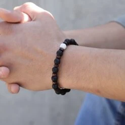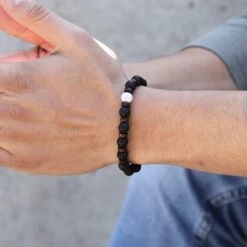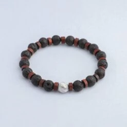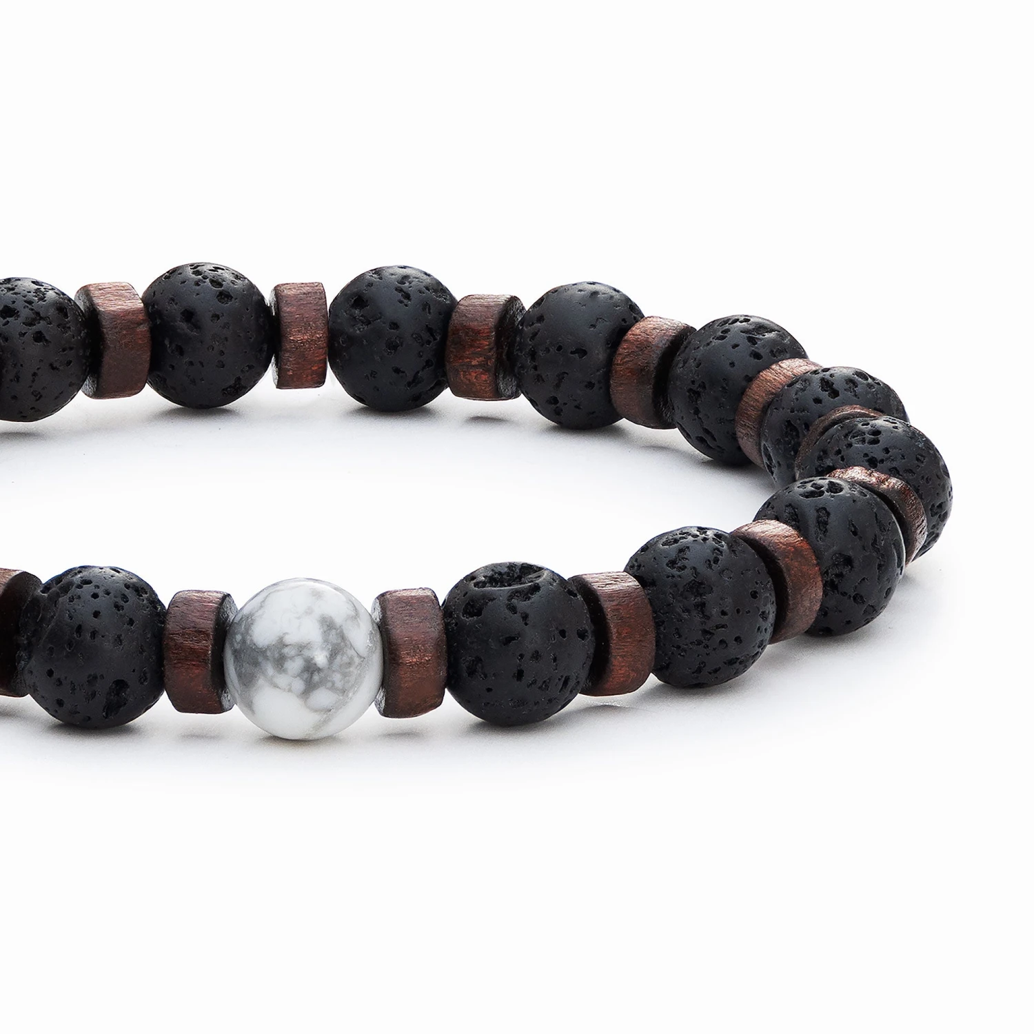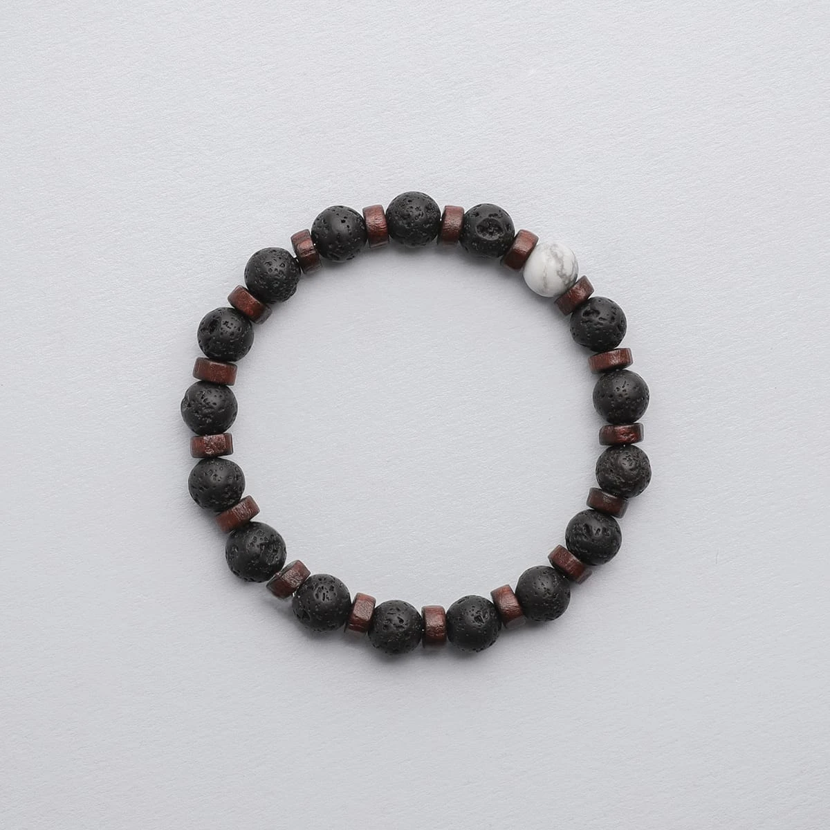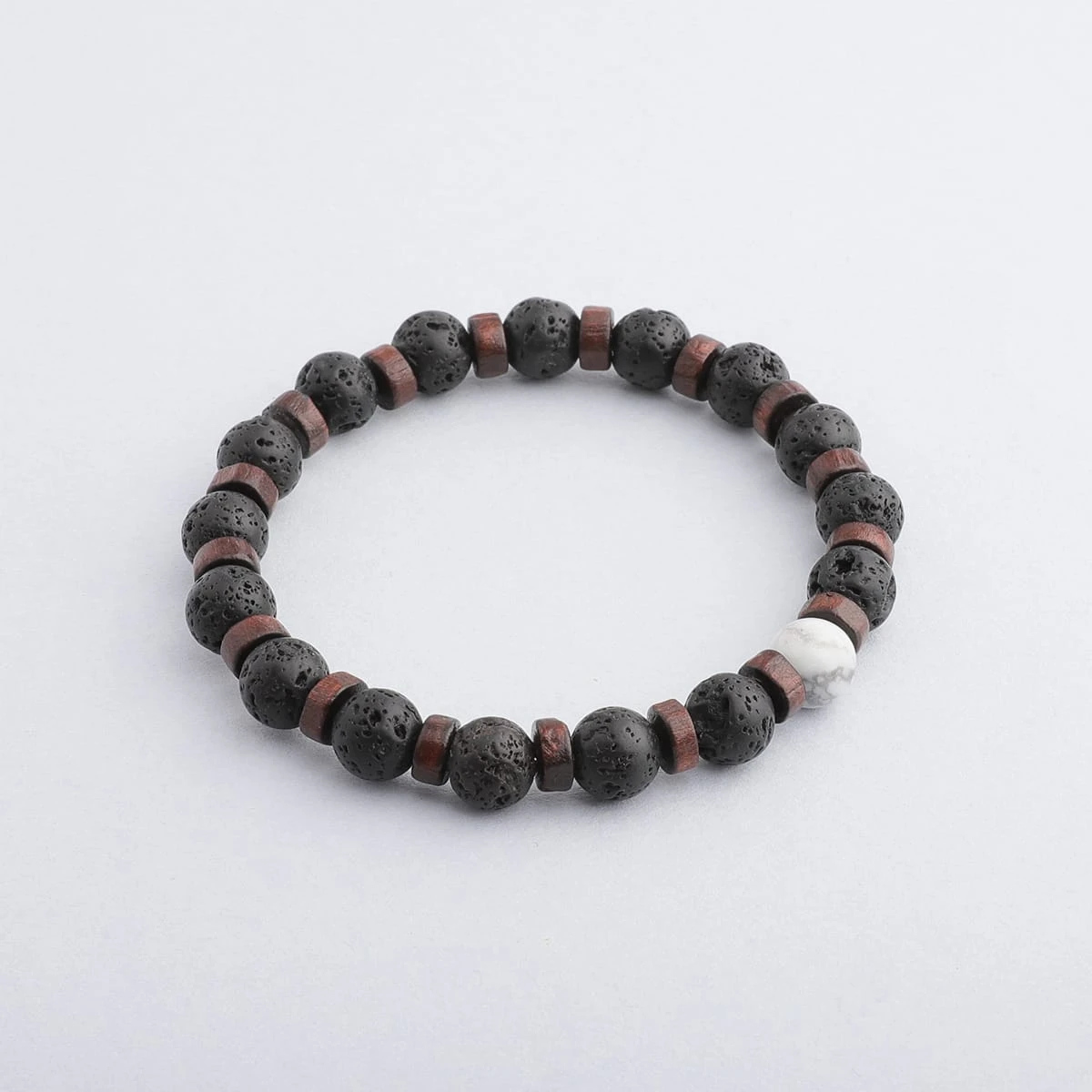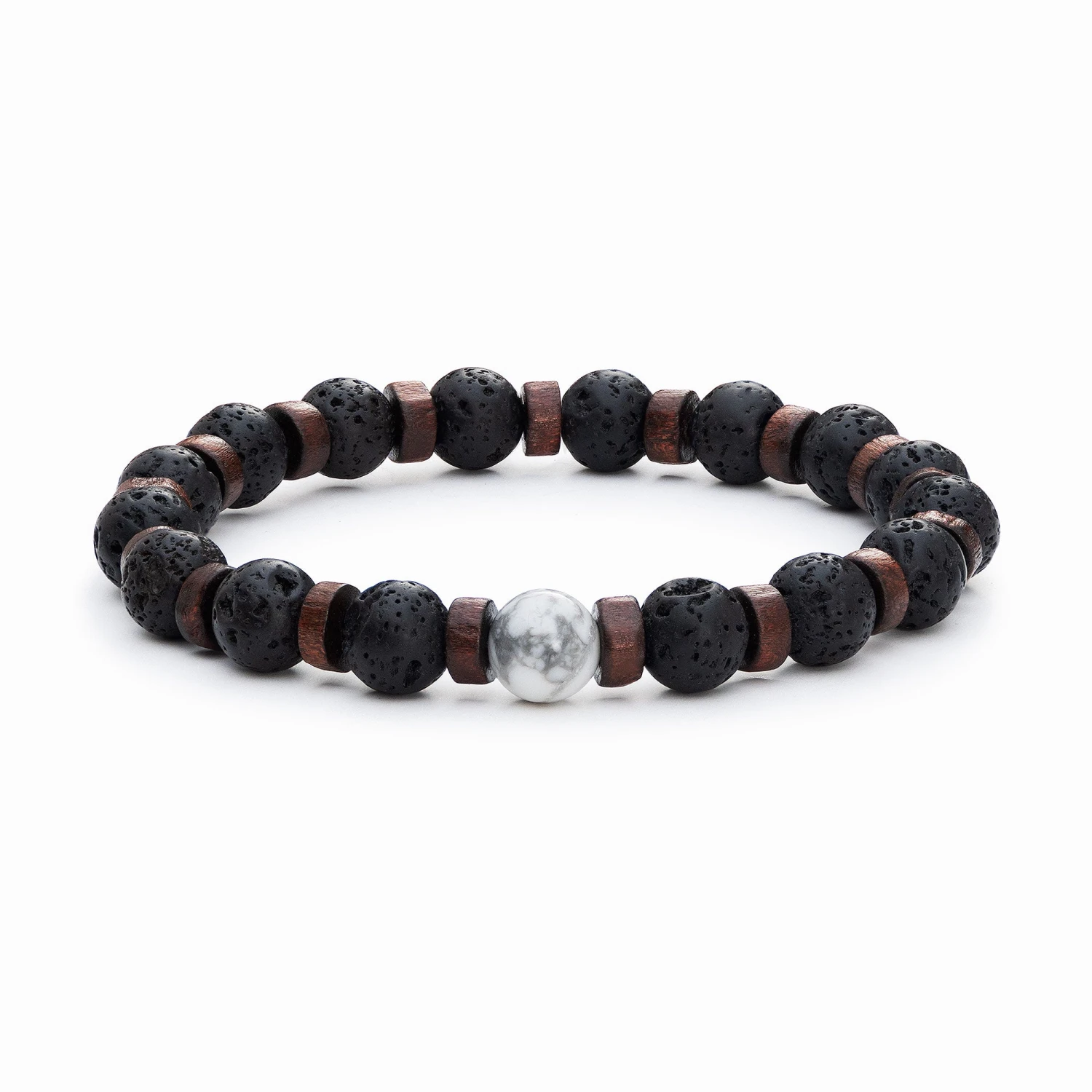 This aromatherapy bracelet includes Lava Stone beads complemented with dark wood spacers, finished with a single White Howlite bead.