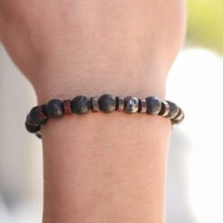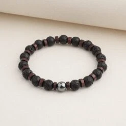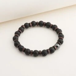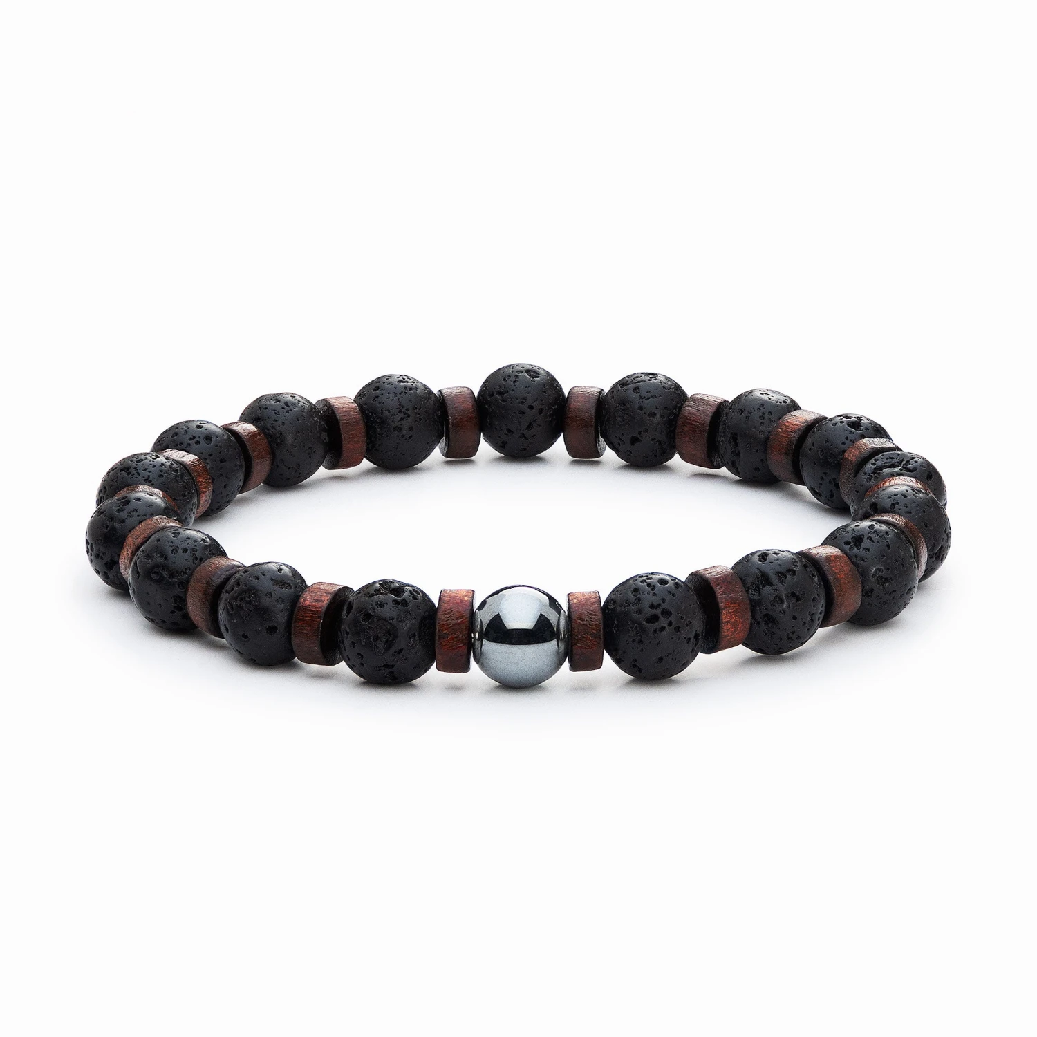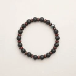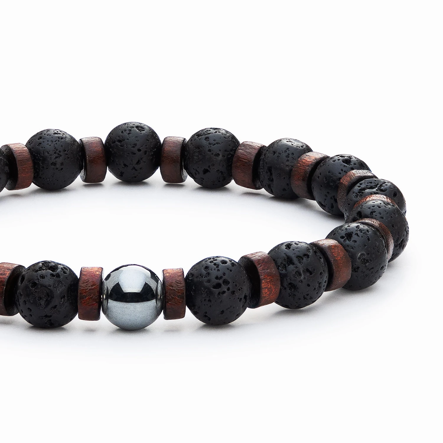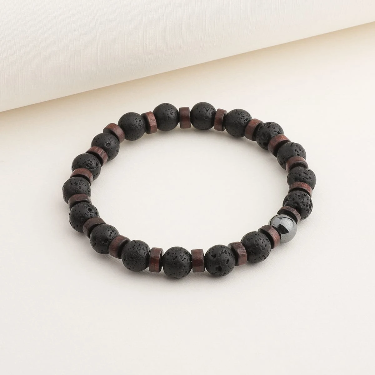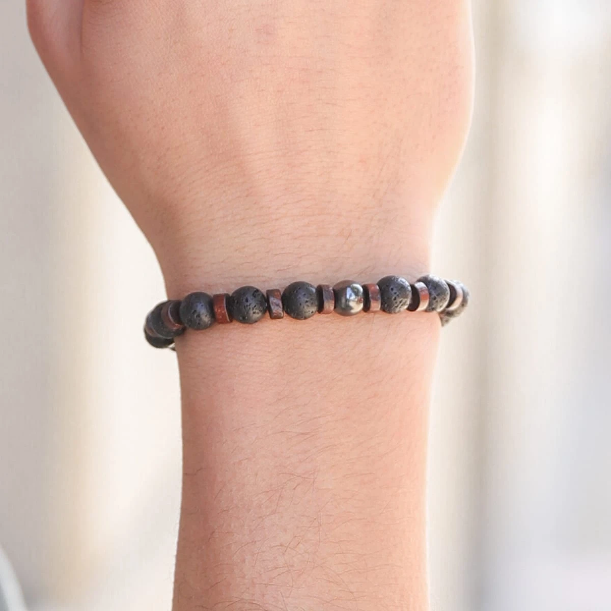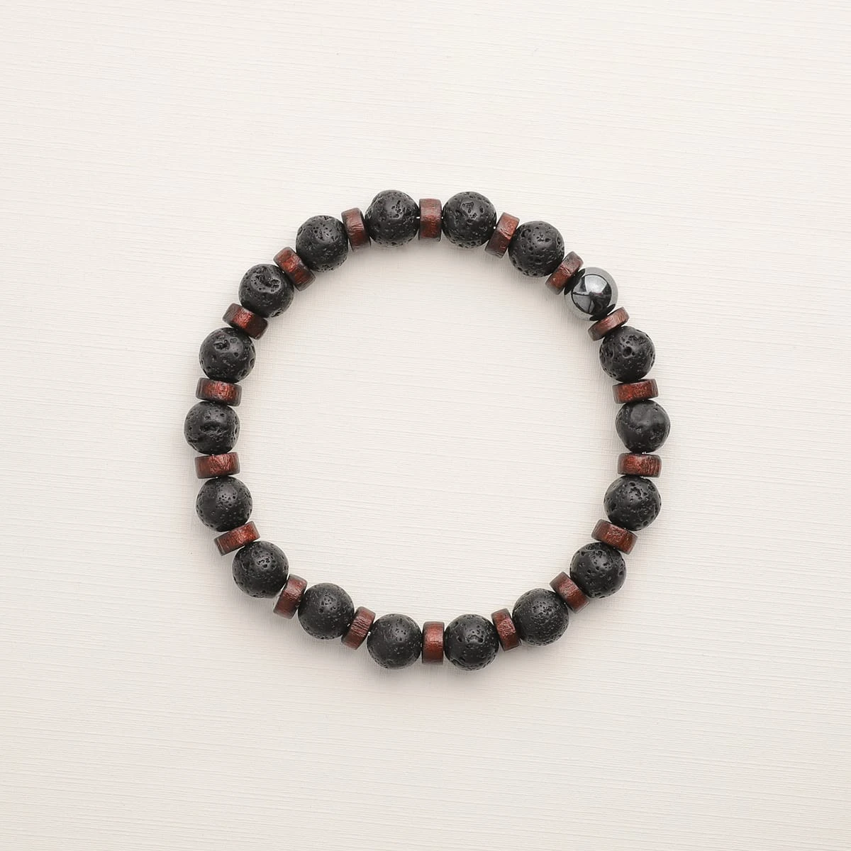 This aromatherapy bracelet includes Lava Stone beads complemented with dark wood spacers, finished with a single Hematite bead.
