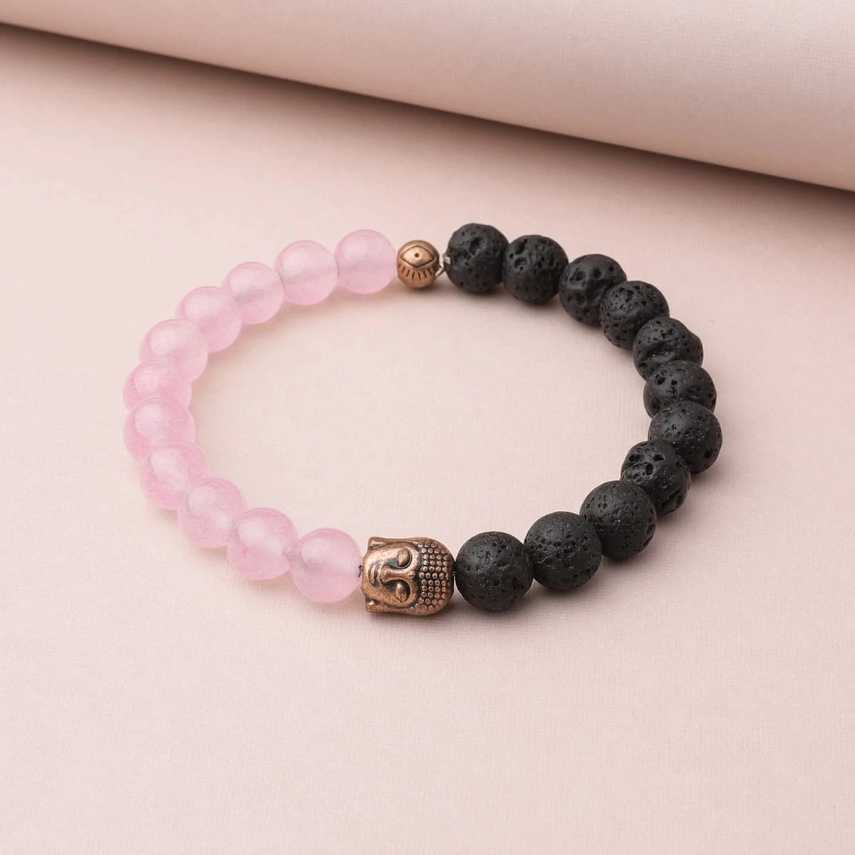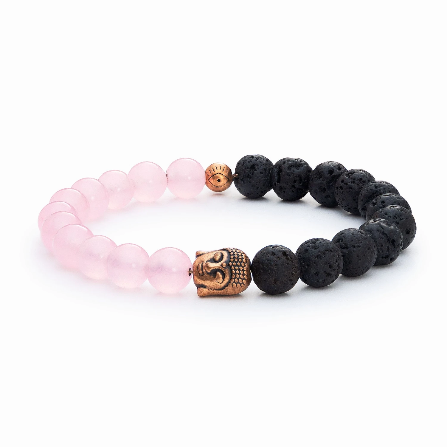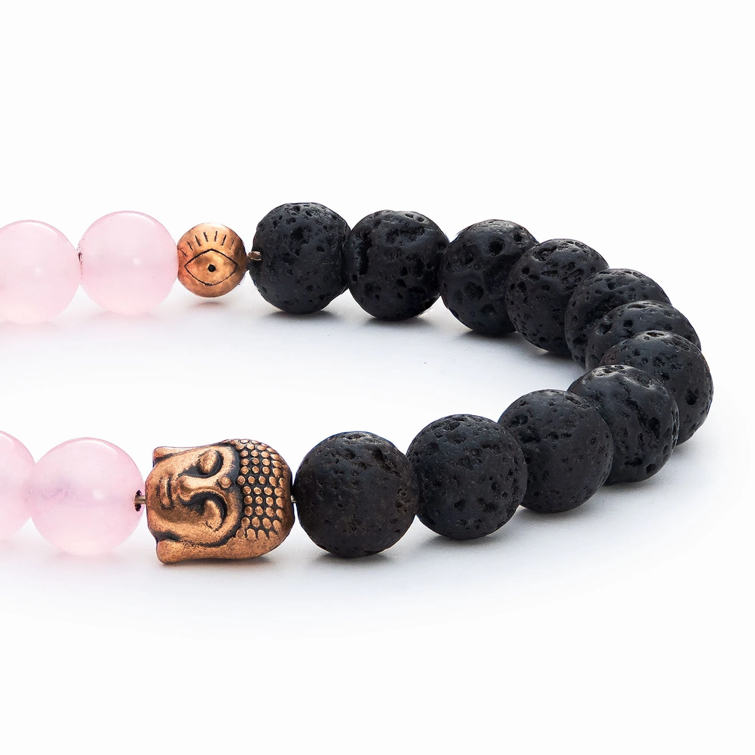 This diffuser bracelet includes Lava Stone beads and Rose Quartz beads with a copper-colored buddha accent. Rose Quartz is a healing, nurturing stone of love and compassion, carrying a tender, feminine energy. It is ideal for encouraging forgiveness, empathy, contentment, and fulfillment. Lava Beads are made from Natural Volcanic Basalt. The lava stones acts as a sponge-like carrier as it soaks up your oils and retains them in the core of the Bead. It is known to be a grounding stone that has connections to Mother Earth promoting strength, stability and courage.