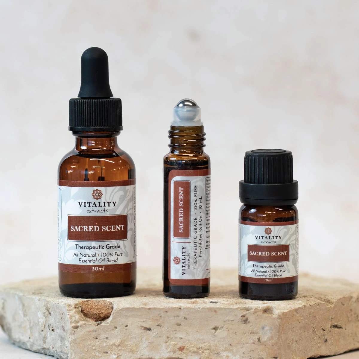 Our blend Sacred Scent takes ancient plants that have been written of in sacred text and enriches them with citrus aroma to create grounding warmth with each inhale.