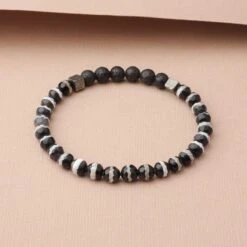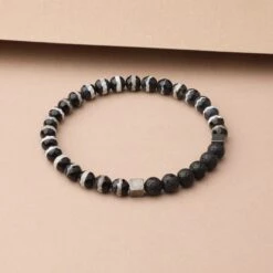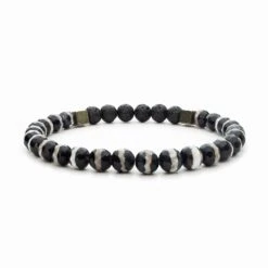This diffuser bracelet features black and white striped Tibetan Agate stones with lava beads for your essential oil needs. The lava stone also known as “basalt” is a porous volcanic rock has been solidified from molten lava after conditions of intense heat and pressure. It is known to be a grounding stone that has connections to Mother Earth promoting strength, stability and courage. Additionally, Tibetan Agate is a stone of luck and protection, dispelling negative energy while also promoting vitality and good fortune. It is ideal for encouraging knowledge, concentration, and mental wellness.