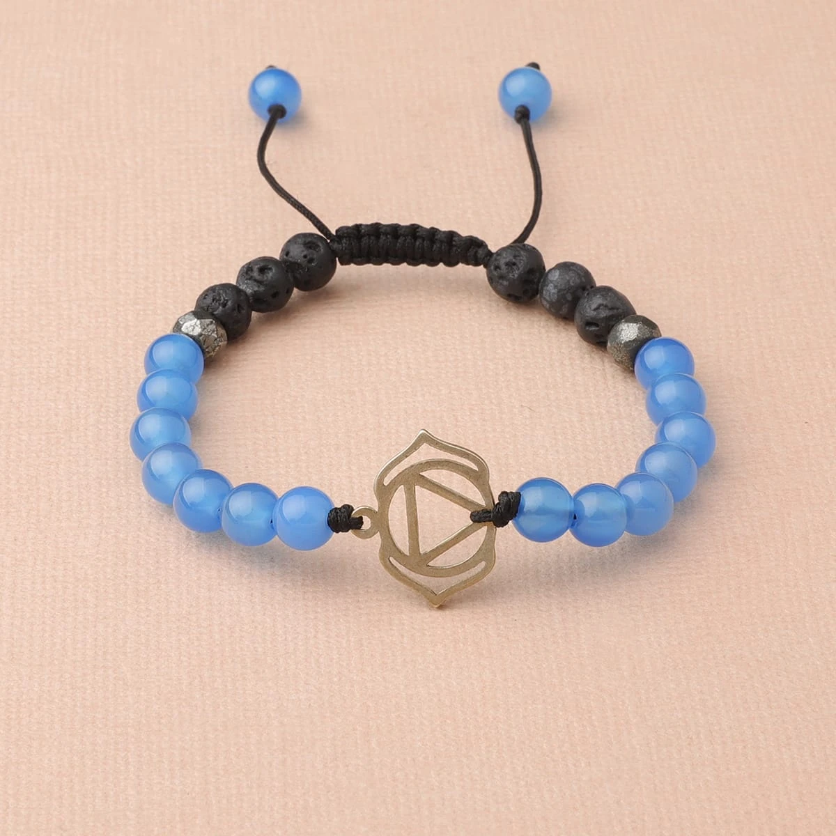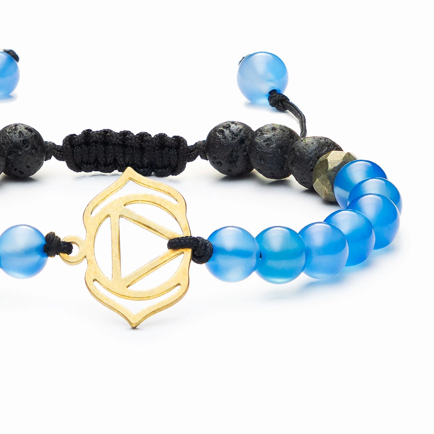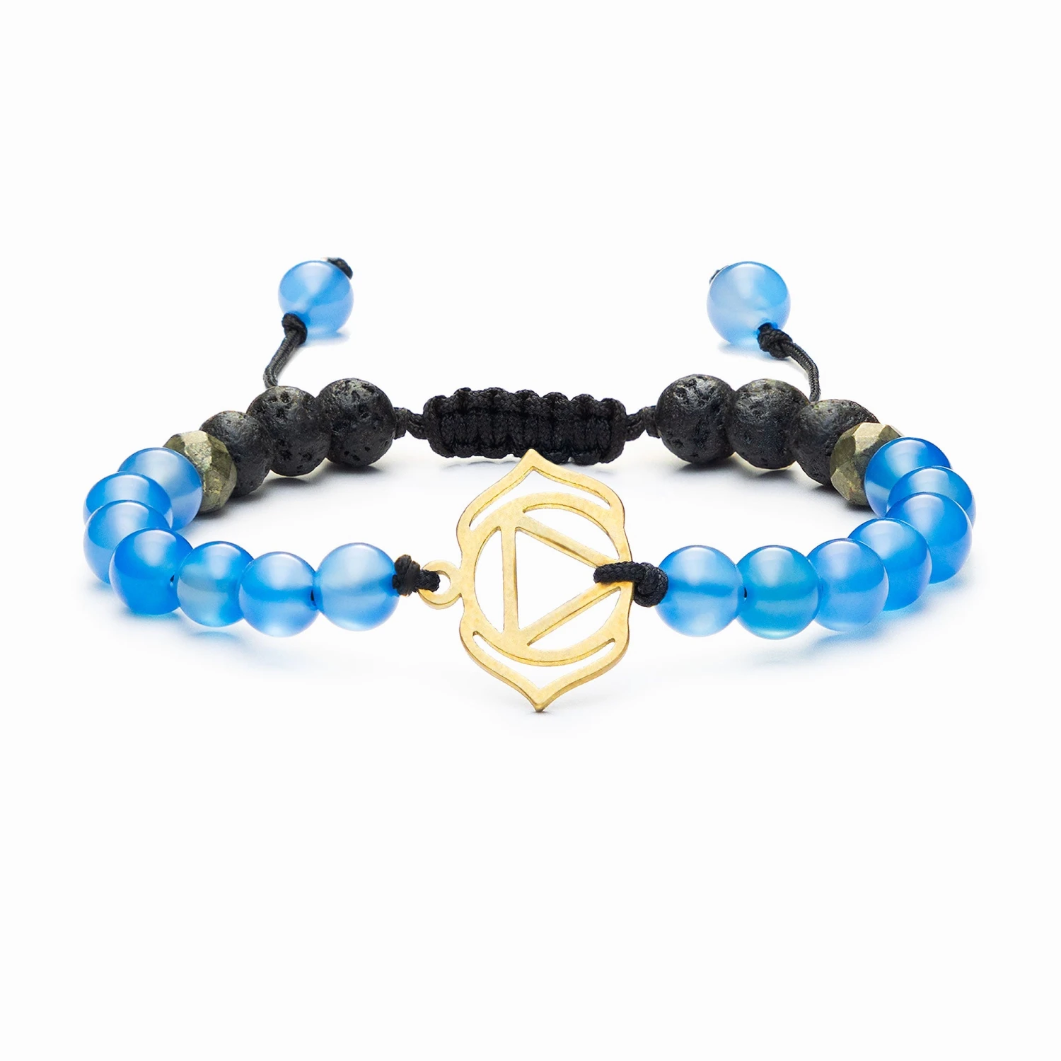Located at the center of the forehead, the third eye chakra is the source of intuition and wisdom. Using blue agate, pyrite and lava stone, this bracelet calms the mind allowing for clarity and ability to see beyond the present moment, to the bigger picture. Lava Beads are made from Natural Volcanic Basalt. The lava stones acts as a sponge-like carrier as it soaks up your oils and retains them in the core of the Bead.
