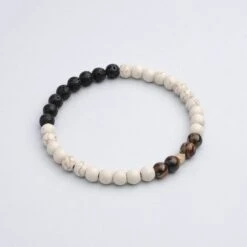 This aromatherapy bracelet includes White Howlite complemented with Tiger’s Eye and finished with Lava Stone beads.