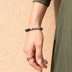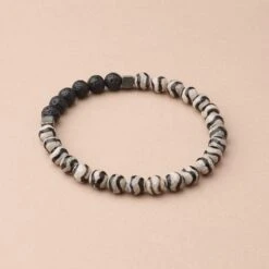 This diffuser bracelet features zebra striped Tibetan Agate stones with lava beads for your essential oil needs. The lava stone also known as “basalt” is a porous volcanic rock has been solidified from molten lava after conditions of intense heat and pressure. It is known to be a grounding stone that has connections to Mother Earth promoting strength, stability and courage. Additionally, Tibetan Agate is a stone of luck and protection, dispelling negative energy while also promoting vitality and good fortune. It is ideal for encouraging knowledge, concentration, and mental wellness.